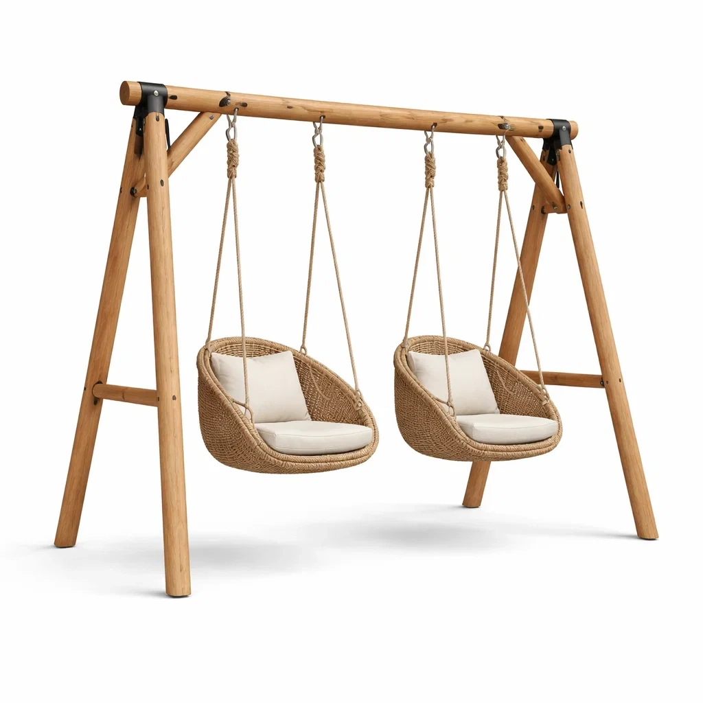 Ensemble de balançoires en acier avec sièges en bois et coussins en polyester