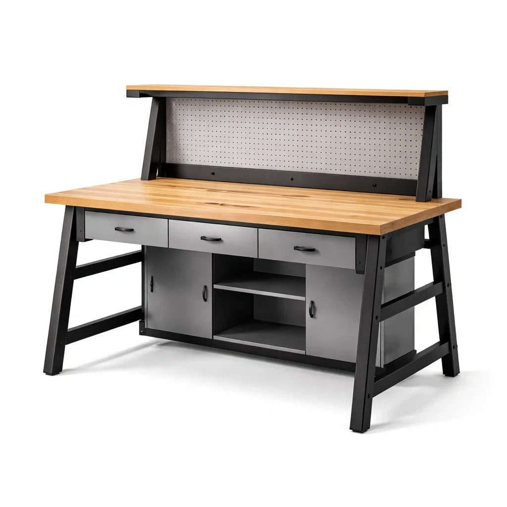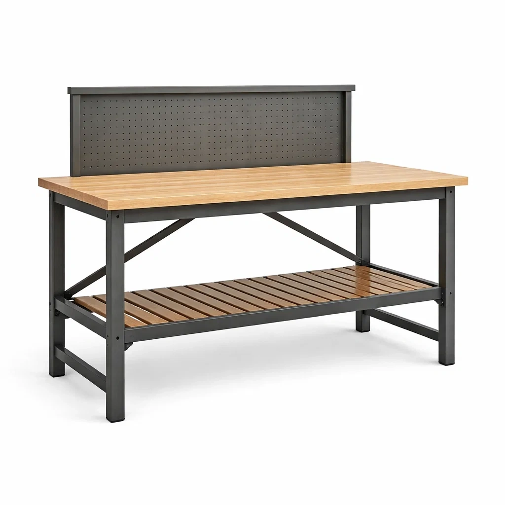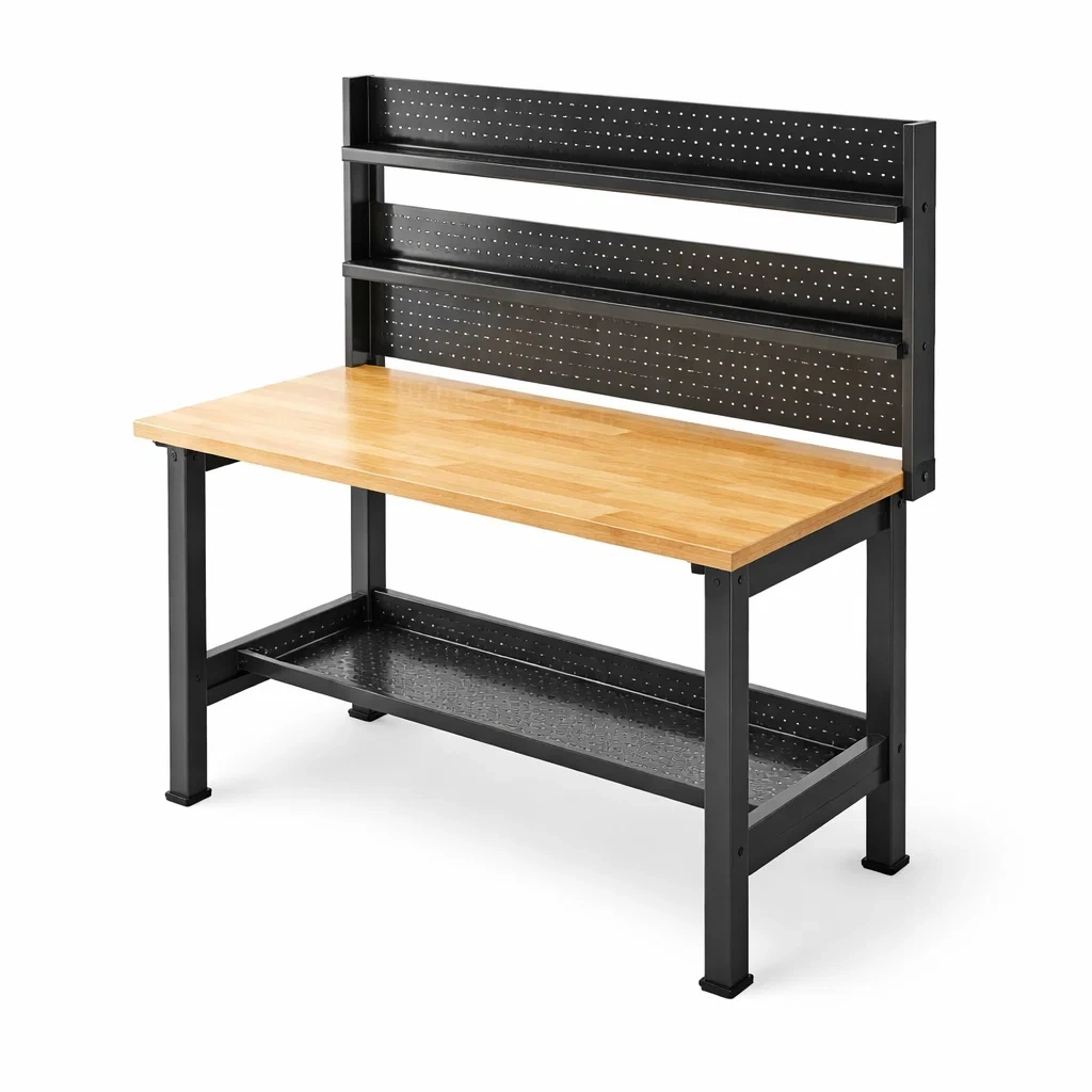 Établi en métal et bois avec rangement et panneau perforé