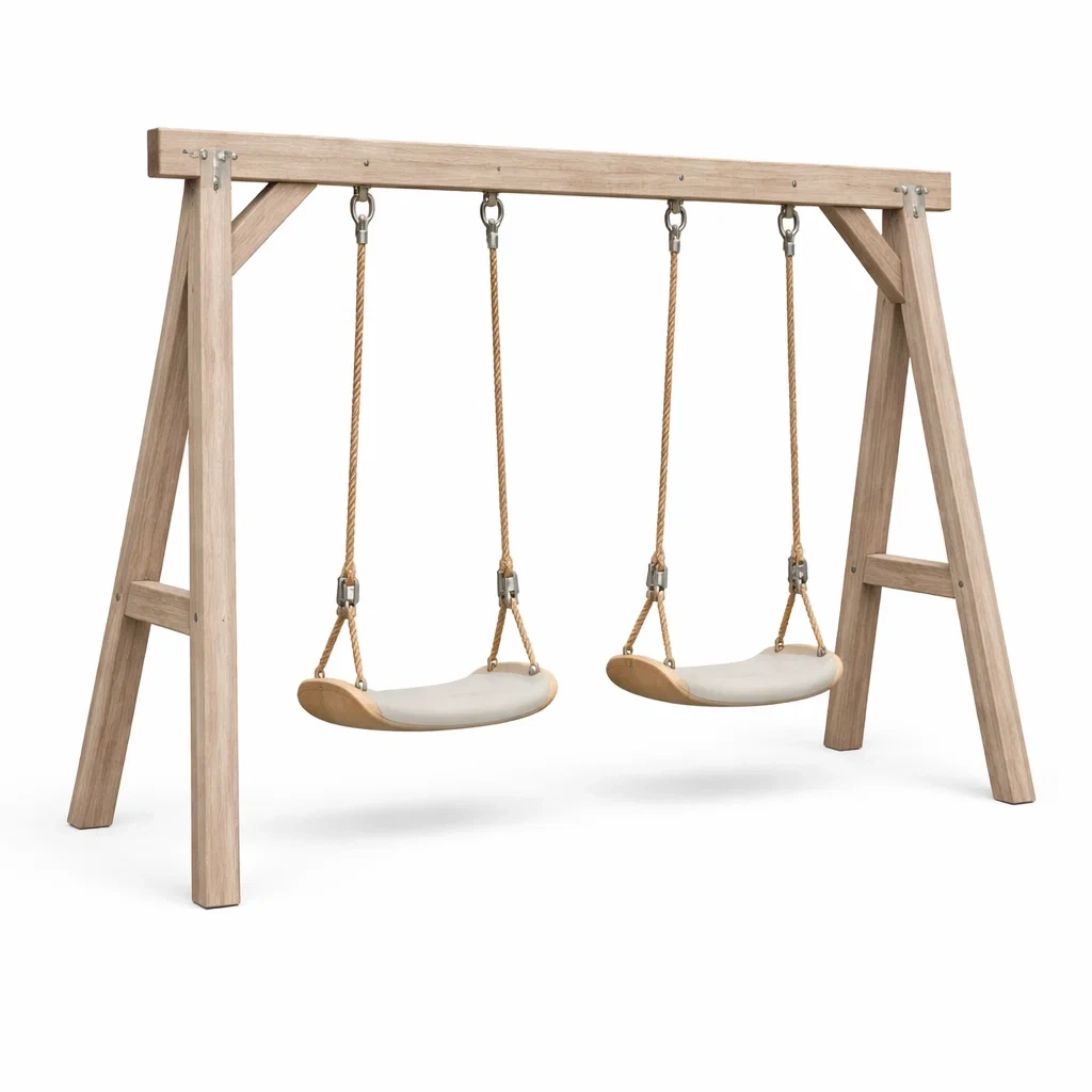 Matériau : Bois massif, corde en fibres naturelles, siège en plastique renforcé.